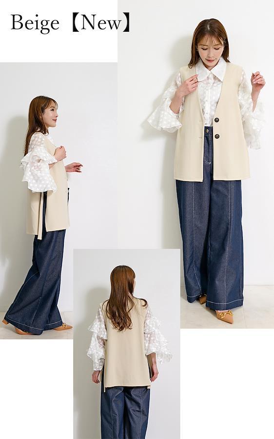 梨地ポンチカットソー素材を使用したサイドベルトカットジレです。