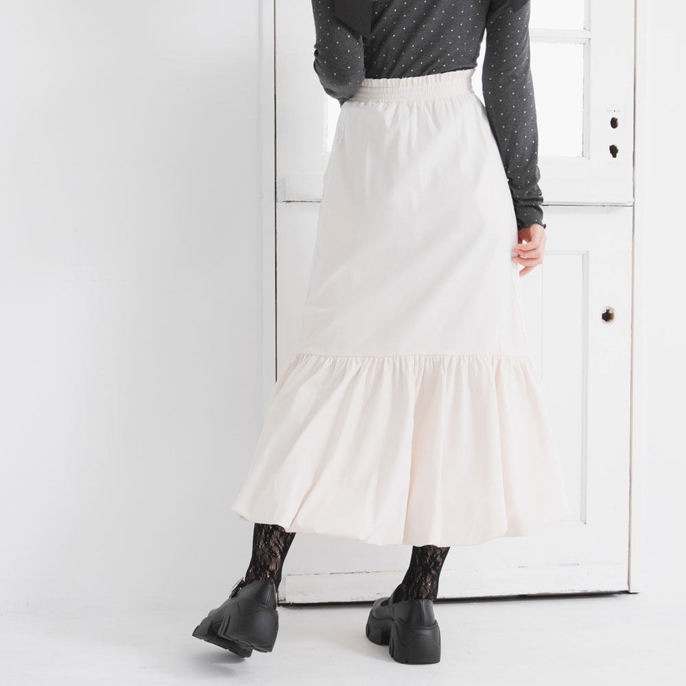トレンド感たっぷりなバルーンヘムデザイン×マーメイド切替を合わせて、女性らしくて丸みのあるシルエットを作り出します。