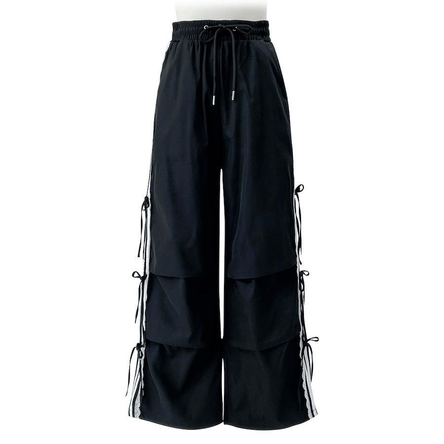 サイドに施された2本ラインやレーステープ、リボンがカジュアル過ぎずガーリーな印象を与えるカーゴパンツ。