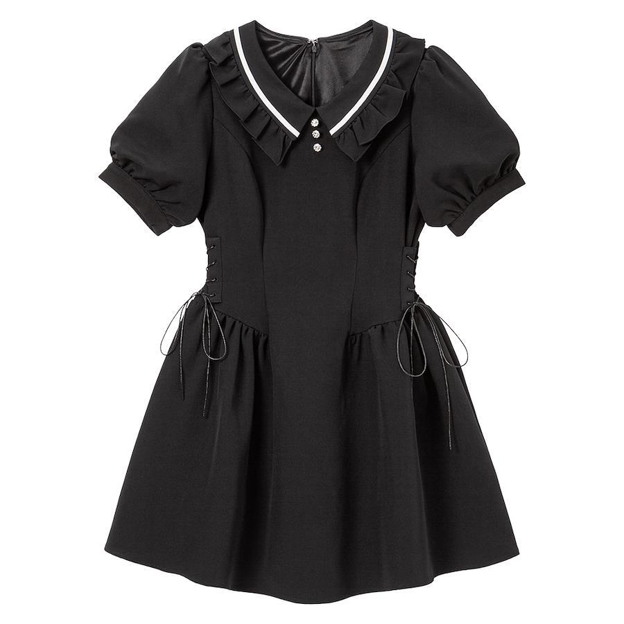 サイドレースアップにスカートのギャザー位置を低くすることで、コルセット感のあるデザインになりスタイルUP効果を狙いました!
