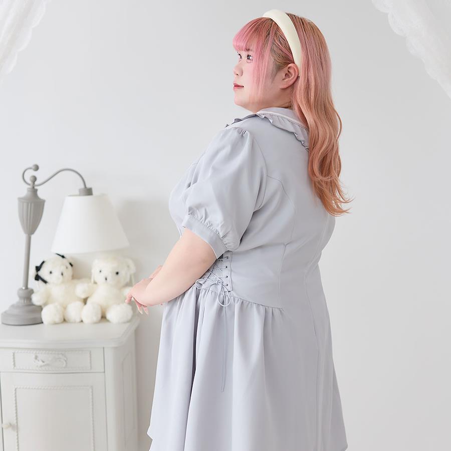 サイドレースアップにスカートのギャザー位置を低くすることで、コルセット感のあるデザインになりスタイルUP効果を狙いました!