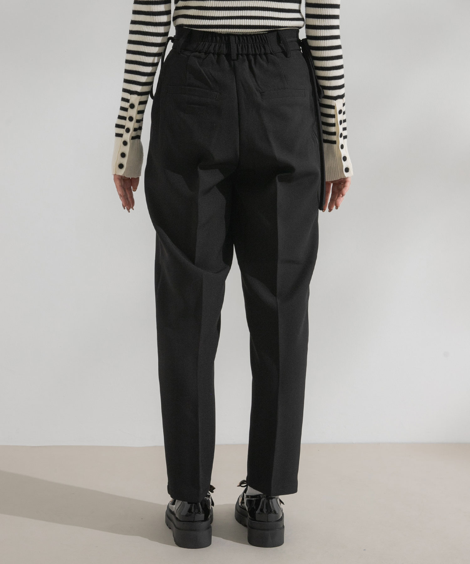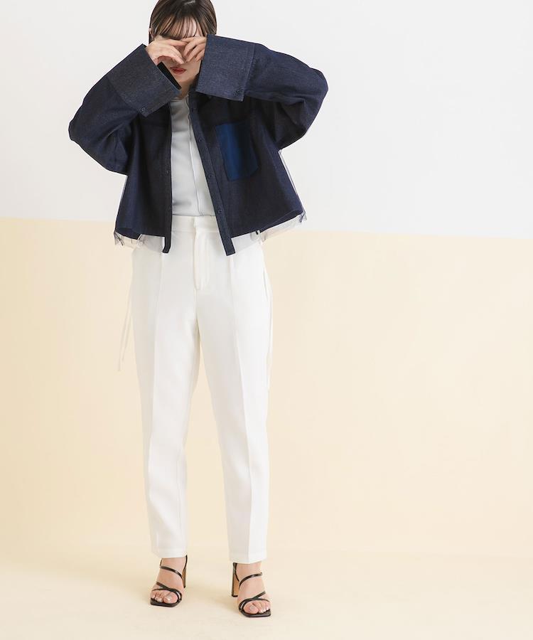 上品さと可愛らしさを兼ね備えたサイドリボンテーパードパンツ。