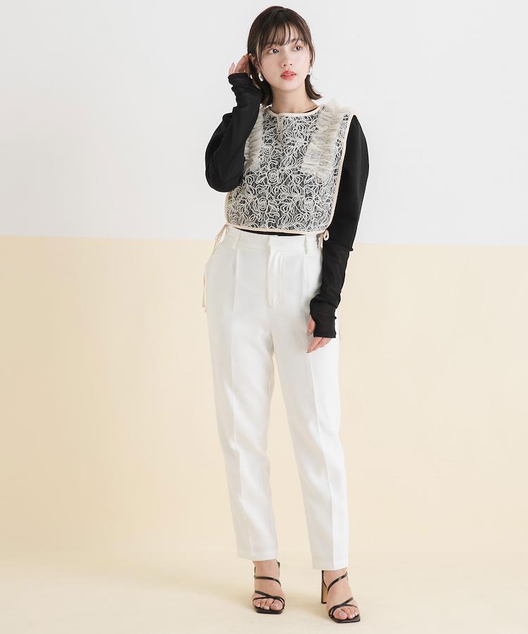 上品さと可愛らしさを兼ね備えたサイドリボンテーパードパンツ。