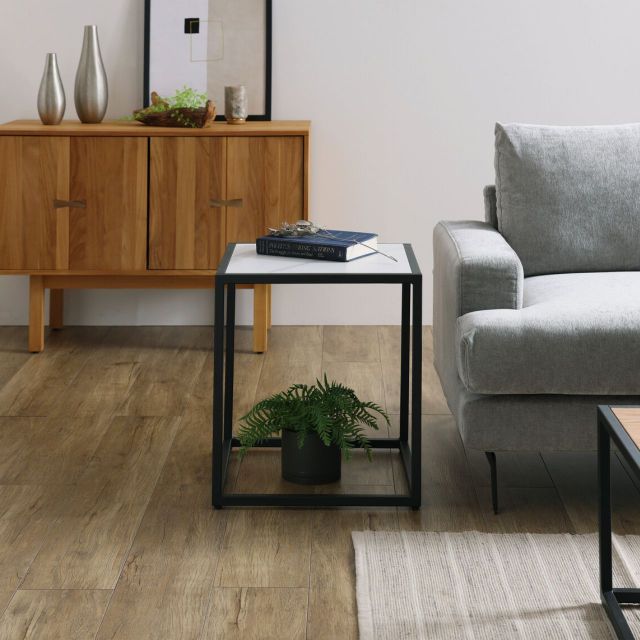 シンプルなデザインの中に素材感で個性を加えたサイドテーブル