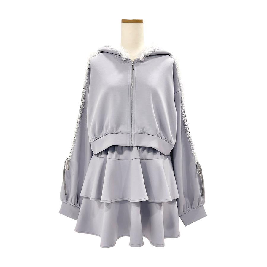 トレンド感たっぷりなスポーティー&ガーリーなスウェット風セットアップが登場!【デザイン】一着でスタイリングが完成し、それぞれセパレートでも活躍するセットアップ♪パーカーはお袖にふりふりのレースとベロアシルバーのラインテープを施し、どこから見ても映えるデザインに♪フードの口にもフリルテープを施したので、後ろ姿も抜かりなく可愛く演出してくれます!スカートもシンプルながら使い勝手も良く、スタイルアップ効果も狙える2段ティア―ドデザインに◎パーカーはフロントジップで開け閉めして着脱する仕様です。スカートはウエスト総ゴムで楽に着脱いただけます。