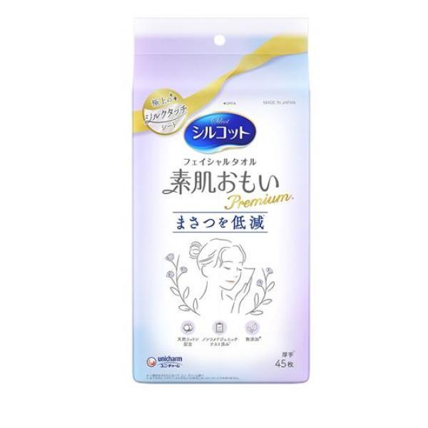 製品の特徴●ユニ・チャーム シルコット フェイシャルタオル 素肌おもい Premium(プレミアム)●まさつ低減(*)シルクタッチシートで洗顔後・お風呂上がり後のお顔の水分をやさしくオフ。[*一般的なタオルに比べて(ユニ・チャーム調べ)]●大判厚手タイプで、1枚で顔全体の水分を、サッと吸収。●シルクのような肌触りのシートで、まさつを低減!●肌に繊維がつきにくい。●MADE IN JAPAN。●天然コットン・植物由来のレーヨン配合。●ノンコメドジェニックテスト済み。※全ての方にコメド(ニキビのもと)が発生しないということではありません。●エタノール、パラベン、石油系合成繊維、蛍光増白剤、接着剤を無添加。●シートサイズ:約200×200mm