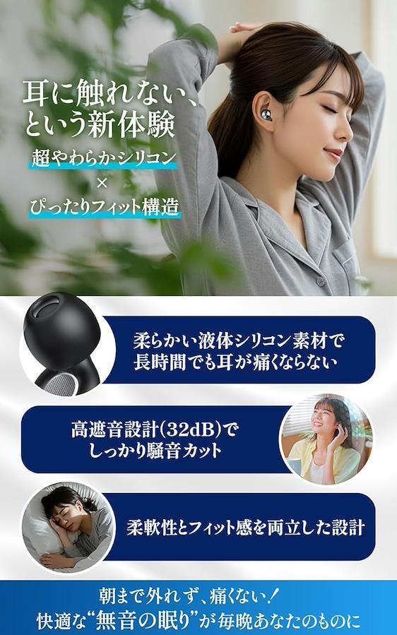 「耳に沿う設計で朝までぴったりフィット」 人間工学に基づいた流線型デザインで、耳にぴったりフィット。