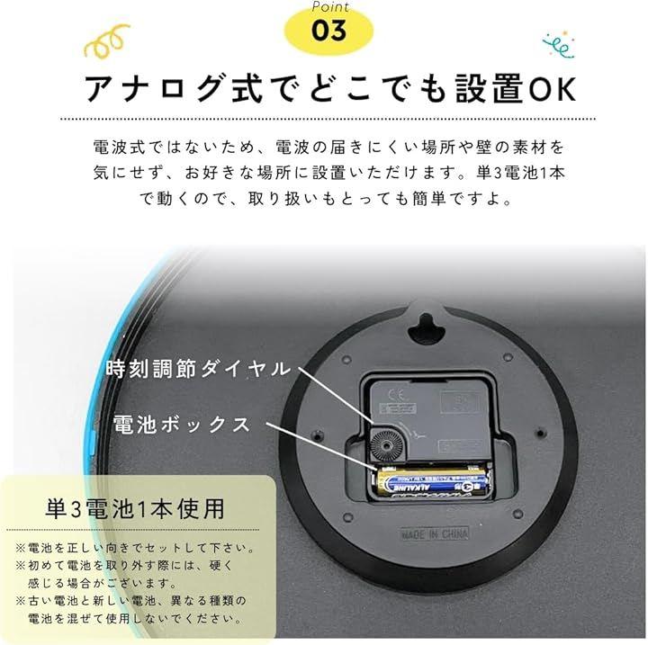 カラフルでおしゃれなアナログ式の壁掛け時計です。