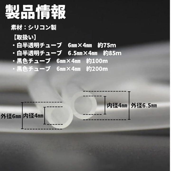 「商品内容」 ・クリアチューブ(内径:4mm 外径:6mm 全長:約75m カラー:半透明 素材:PVC) ・厚手クリアチューブ(内径:4mm 外径:6.5mm 全長:約85m カラー:半透明 素材:PVC) ・黒チューブ(内径:4mm 外径:6mm 全長:約100m/約200m カラー:ブラック 素材:PVC)