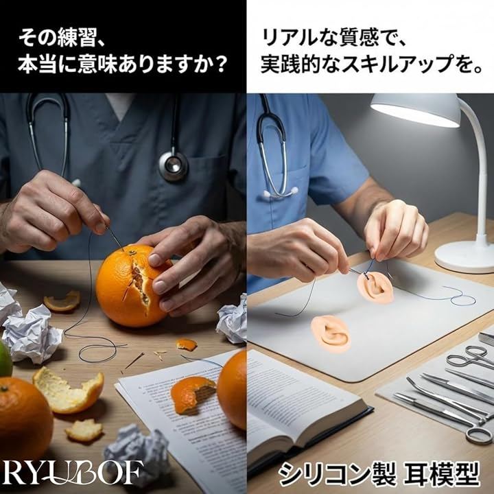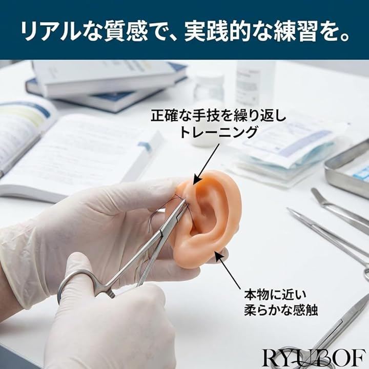 実際の耳に近いサイズと形状で、針を打つ感触や縫合の抵抗感をリアルに再現でき、初心者から専門学生、医療現場での練習まで幅広く活用できます。