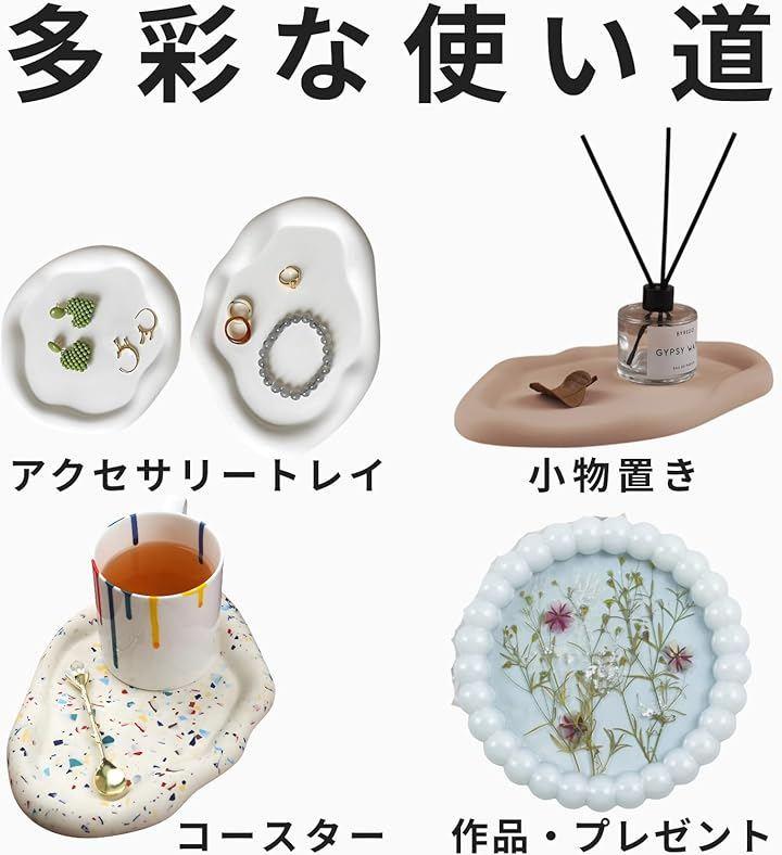 「日常を彩るハンドメイドの世界へ」 シリコンモールドを使えば、レジンや石膏、ジェスモナイトで美しいトレイやコースターを簡単に作ることができます。