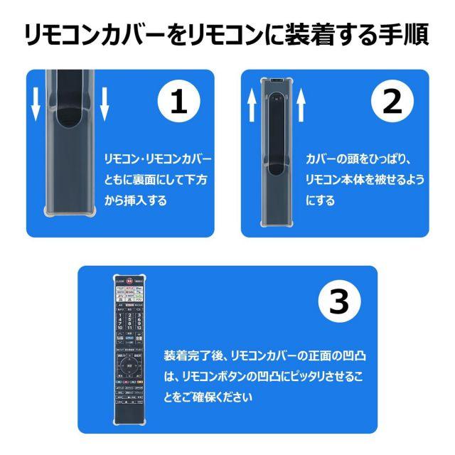 ・汚れや埃から守るシリコンカバー:お水が入ったコップを倒したとき、水の侵入も防ぎます。(防水機能はございません。)・リモコンカバーをリモコンに装着する手順リモコン・リモコンカバーともに裏面にして下方から挿入するカバーの頭をひっぱり、リモコン本体を被せるようにする装着完了後、リモコンカバーの正面の凹凸は、リモコンボタンの凹凸にピッタリさせることをご確保ください。・シリコンの性質上入れにくいことがあります。ゆっくりと少しずつ、上下左右に伸ばしながら装着してください。ボタン位置のずれがある場合も同様に上下左右伸ばして調整ください。・無理な力が掛かると破れる場合がございますのでご注意ください。