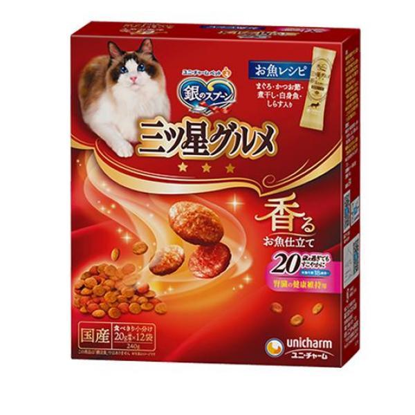 製品の特徴●ユニ・チャームペット 銀のスプーン 三ツ星グルメ 香るお魚仕立て 20歳を過ぎてもすこやかに(対象年齢:18歳頃~)腎臓の健康維持用●お魚レシピ(まぐろ・かつお節・煮干し・白身魚・しらす入り)●成猫用総合栄養食(主食)●香ばしく焼き上げ香りまで贅沢な、お魚の美味しさが詰まったキャットフード(ドライタイプ)です。●腎臓の健康維持に配慮して、リンを制限した栄養設計(※銀のスプーン三ツ星グルメ全成長段階用比)●腎臓の健康維持に配慮して、ナトリウムの含有量を調整、オリゴ糖配合。●ビタミンE強化で健康維持により、免疫力を保ちます。●猫の下部尿路の健康維持に配慮して、マグネシウム量を調整(含有量0.08%:標準値)●おいしさと豊かな風味を逃さない、食べきり小分けパック。●必要な栄養素がバランスよく取れますので、本製品と水のみで毎日の食事として与えることができます。●原産国名:日本(国産品)●内容量:20g(標準)×12袋●シニア猫/高齢猫/ねこネコ/ドライフード/ごはん/みつぼしぐるめ/鮪鰹
