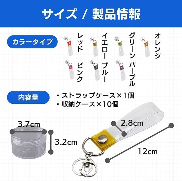 「サイズ」ストラップケース:長さ=12cm、幅=2.8cm収納ケース:高さ=3.2cm、直径=3.7cm「カラーバリエーション」・レッド・イエロー・グリーン・オレンジ・ピンク・ブルー・パープル「内容量」・ストラップケースx1個・収納ケースx10個