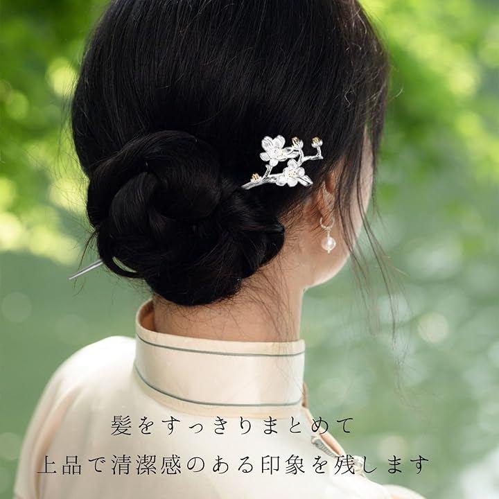 「コーディネートアップ」ネイビーのワンピース、ブラックのタートルネックなど、ダークカラーの服装に合わせれば、簪の白と銀の輝きが際立ち、洗練されたコントラストを生み出します。