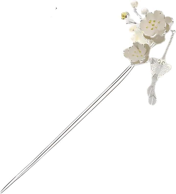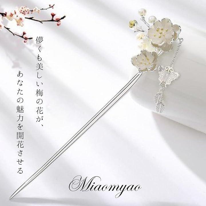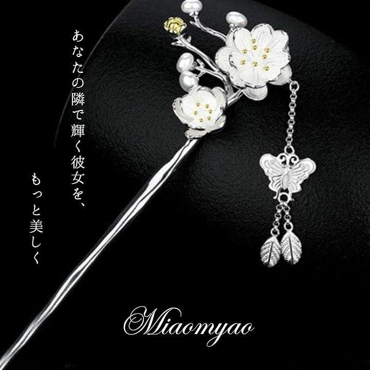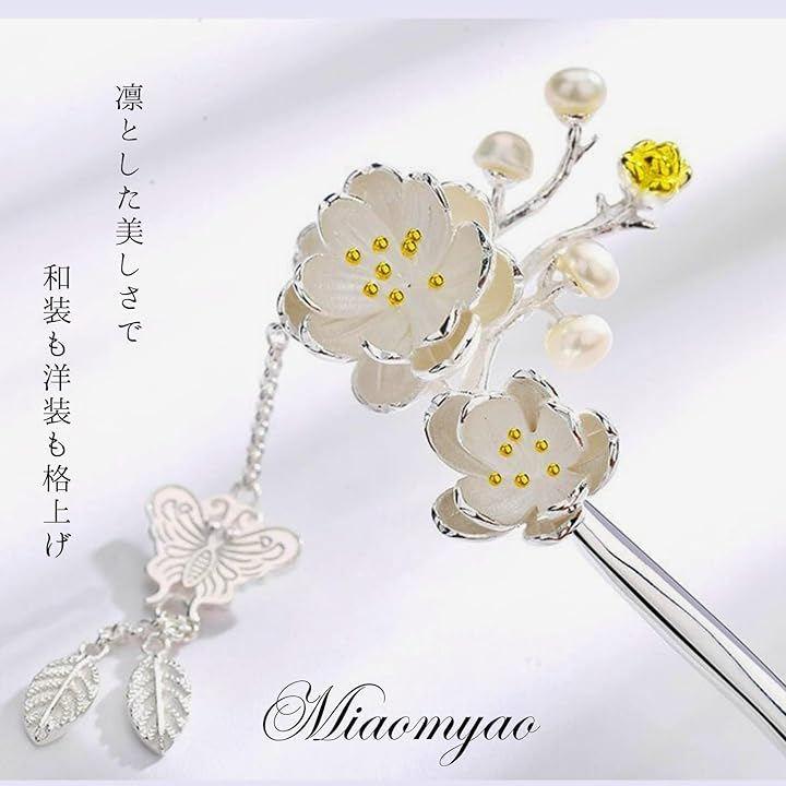 「商品特徴」シルバーメッキブロンズ製のこのかんざしは、上品な立体的な銀色の梅の花と、その傍らを舞う蝶のデザインが特徴です。