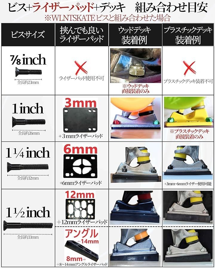 色: 8x14mm(ANGLE) +1 1/2" ビス #素材:ハードPP素材(RISER PADS) |