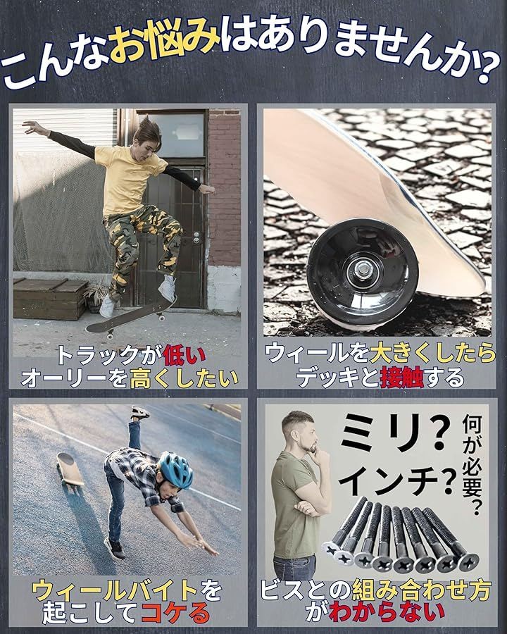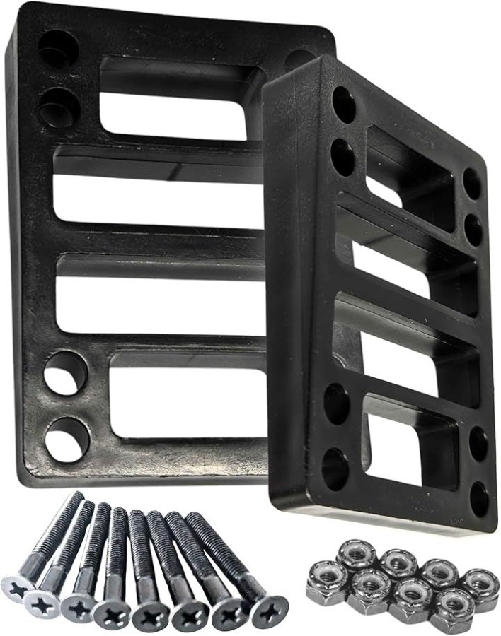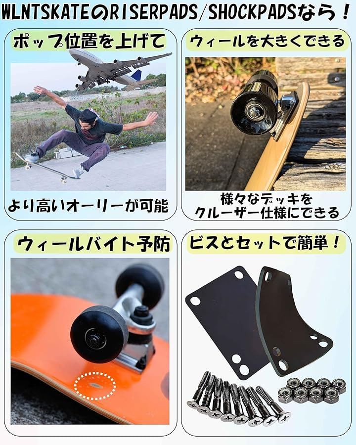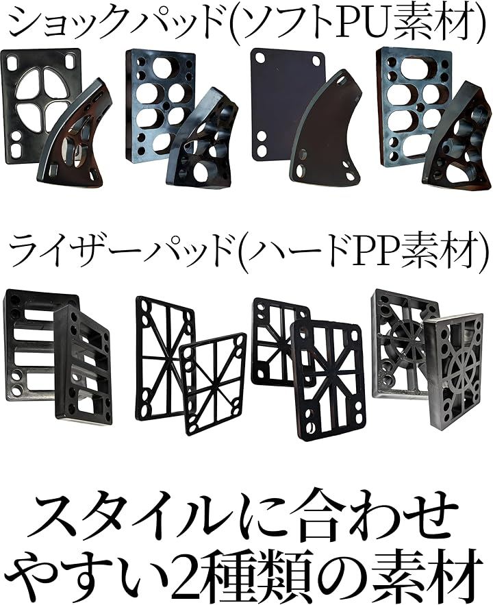 LowのトラックからボードをちょっとHiにして、オーリーの高さを上げたい…ウィールが少し大きくてバイトしやすい…などといった方におすすめです。また、これからウィールを大きくしてクルージングを楽しめたい方のデッキの振動、音の軽減にもおすすめします。スケートの楽しさが増しますのでぜひお試しくださいませ。