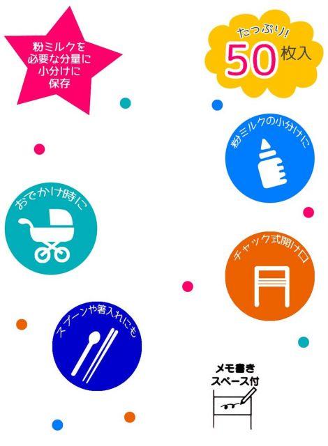 粉ミルクを必要な分量に小分けに保存チャック式の開け口おでかけ時のスプーンや箸仕入れにも便利メモ書きスペース付お出かけ時のミルク等の持ち運びに最適衛生上一回の使い切りとしてその都度、新しい袋をご利用ください