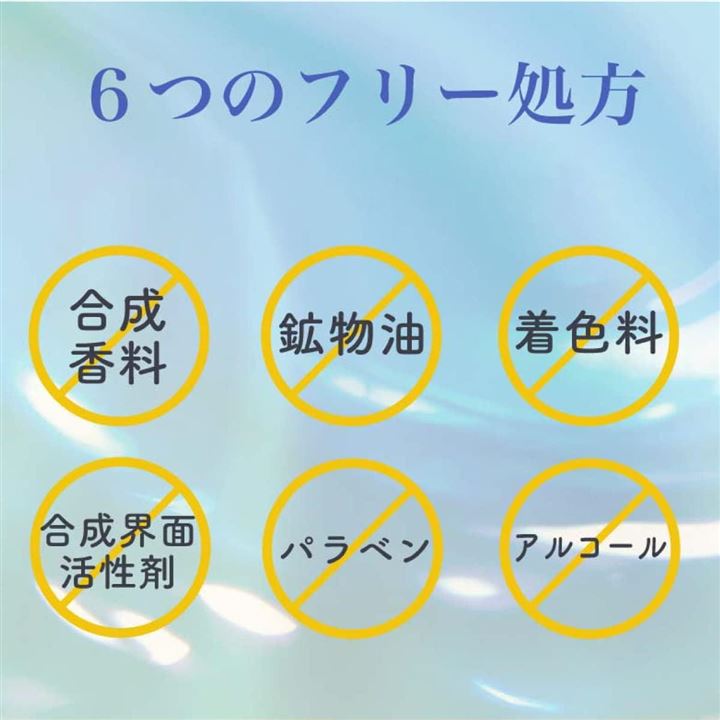 一般的な化粧水に含まれている「合成香料・鉱物油・着色料・合成界面活性剤・パラベン・アルコール」を全てフリー処方にしています。食品レベルの天然成分にこだわったことで肌への刺激が少ないため、敏感肌や乾燥肌の方にも快適にお使いいただけます。