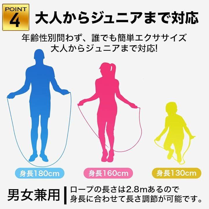ロープの長さを簡単に調節することができるので、大人からジュニアまで幅広くご利用いただける縄跳びです。