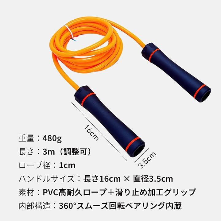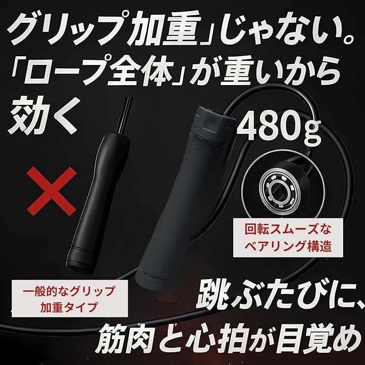 この480g加重縄跳びは、ロープ自体に重量を持たせることで、跳ぶたびに肩・腕・体幹まで同時に刺激します。