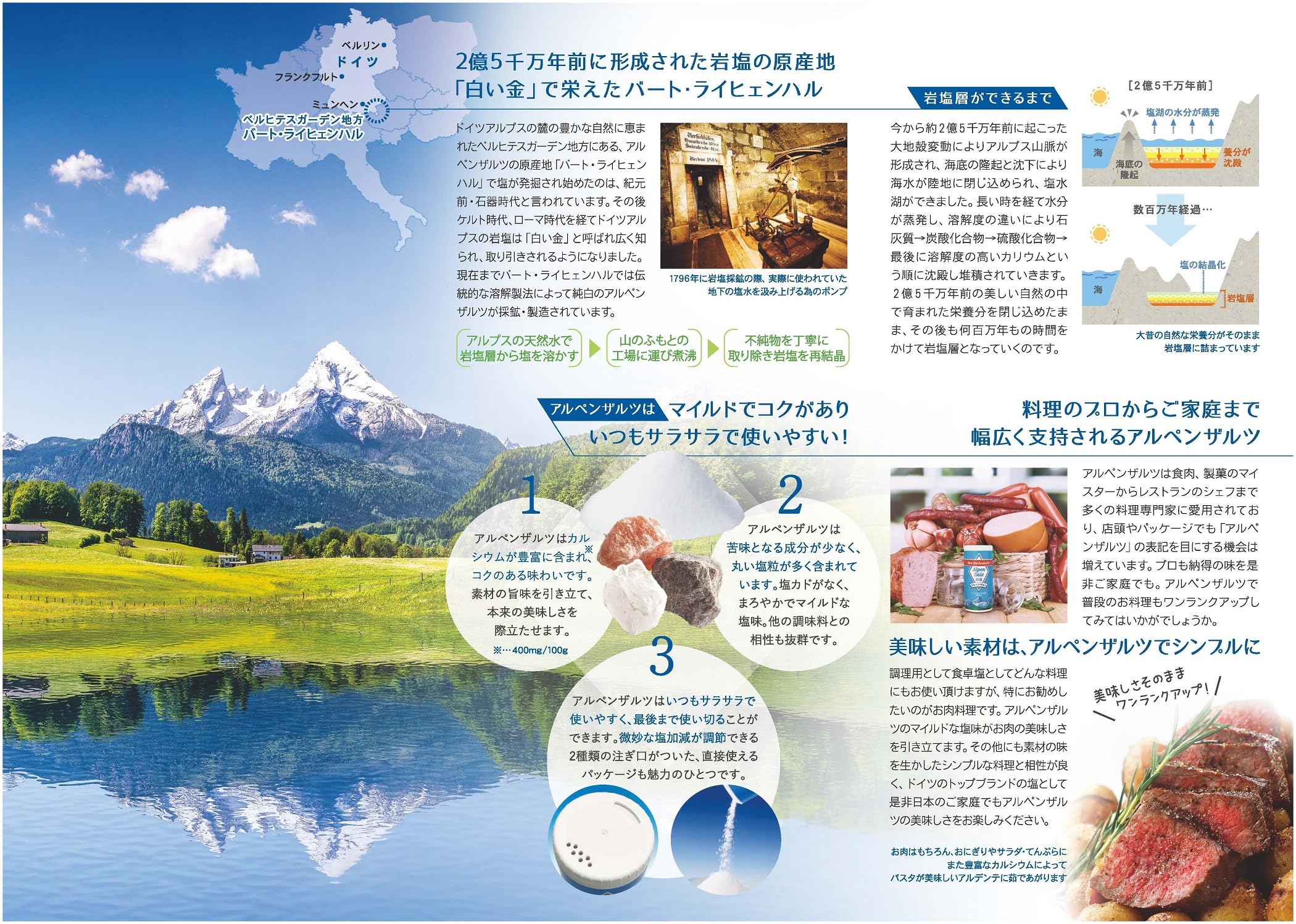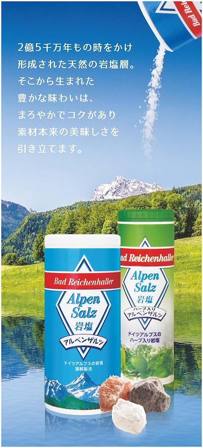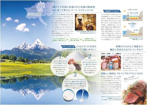 アルペンザルツは、ドイツアルプス山脈のふもとにあるバート・ライヒェンハルの岩塩層から作られました。この岩塩層は、2億5千万年前に形成された天然の岩塩層です。マイルドでコクのある味わい&カルシウムが豊富アルペンザルツは、マイルドでコクのある味わいが特徴です。調理用として、食卓塩としてどんな料理にもお使い頂けますが、特にお薦めしたいのは素材の味を生かしたシンプルなお料理です。たとえば、「おにぎり」「モッツァレラチーズとトマトのサラダ」「てんぷらの付け塩に」「グリルしたお野菜やお肉」などです。