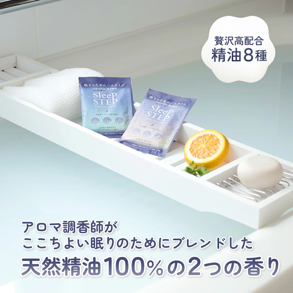 【商品名/型番】SLEEP STEP ミルクバスパウダー スイートドリーム 45g / 4538037072401(フローラルラベンダーの香り)SLEEP STEP ミルクバスパウダー クリアビューティ 45g / 4538037072418(ハーバルベルガモットの香り)