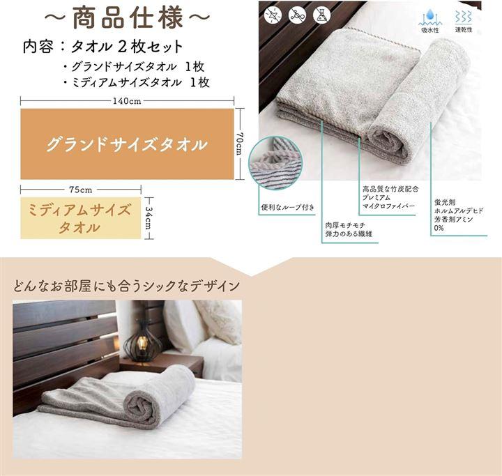 ・「内容:竹炭抗菌タオル2枚セット」グランドサイズタオル(70cmx140cm)1枚+ミディアムサイズタオル(34cmx75cm)1枚 「素材」ポリエステル90%、ナイロン10% 「カラー」グレー/グレーストライプ いずれかをお選びいただけます。