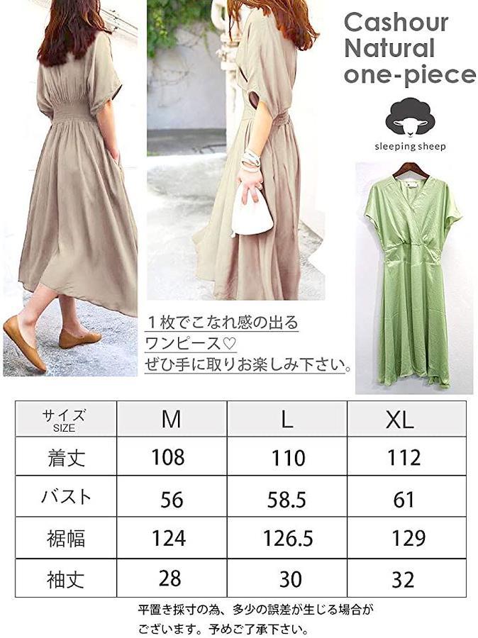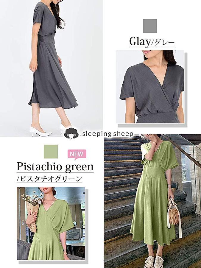 ナチュラルなこなれ感カシュクールワンピースVネック半袖ミモレ丈シンプルゆったりロングワンピフレアワンピース5分袖レディース