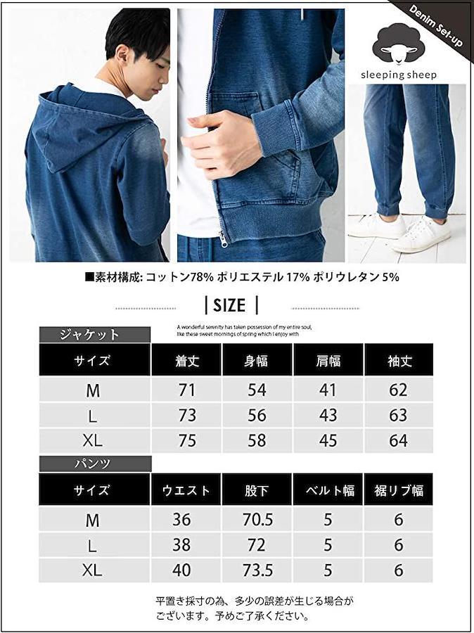 ・素材構成: コットン78% ポリエステル 17% ポリウレタン 5% 中国製 ジャケット(cm) М(着丈71 身幅54 肩幅41 袖丈62) Ⅼ(着丈73 身幅56 肩幅43 袖丈63) XL(着丈75 身幅58 肩幅45 袖丈64) パンツ(cm)М(ウエスト幅36 股下70.5 ベルト幅5 裾リブ幅6) Ⅼ(ウエスト幅38 股下72 ベルト幅5 裾リブ幅6) XL(ウエスト幅40 股下73.5 ベルト幅5 裾リブ幅6)