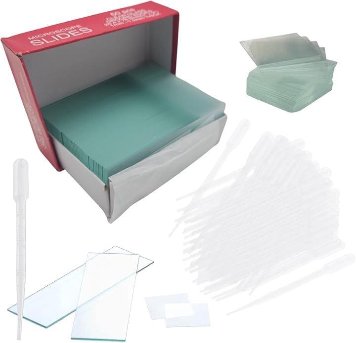 スライドガラスとカバーガラスとスポイト使い捨てのセットです。