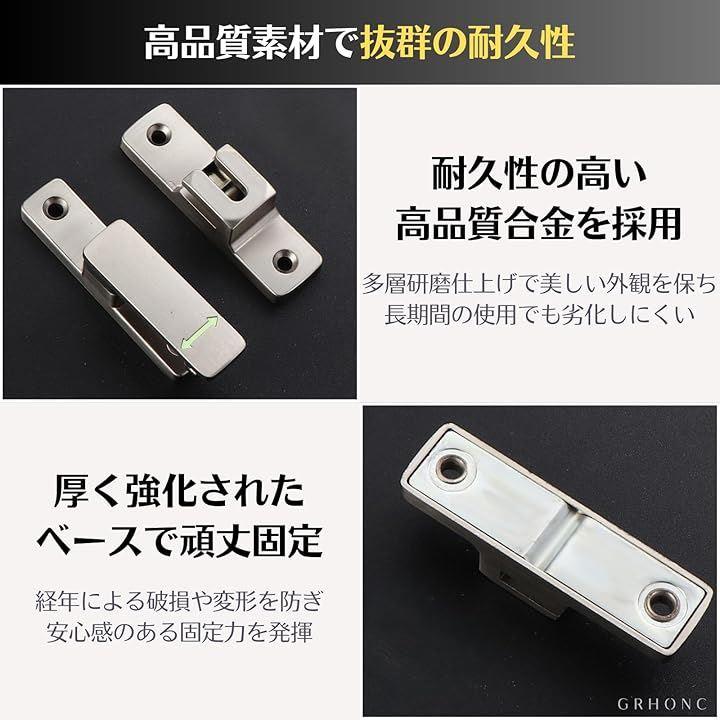 「セット内容」本体+ネジ4本「カラー」ブラック/シルバー「素材」高品質合金「機能」ユニバーサルデザイン/90度&180度対応/蛍光機能「対応ドア」引き戸/片開きドア/両開きドア/ふすま/門扉/トイレ/押し入れ/ポスト「用途」チャイルドロック/ペット脱走防止/防犯対策/部屋鍵の後付け