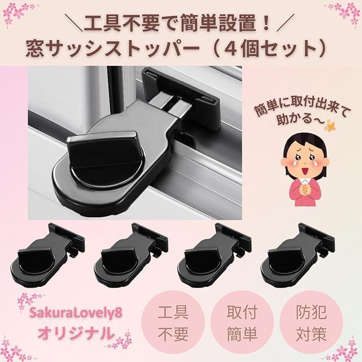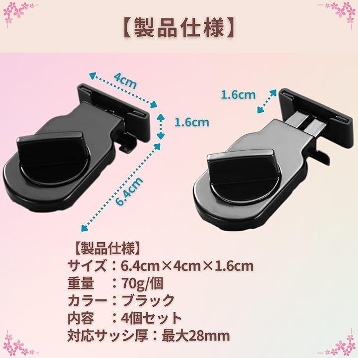 「製品仕様」サイズ:6.4cmx4cmx1.6cm、重量:70g/個、カラー:ブラック、内容:4個セット、対応サッシ厚:最大28mm。