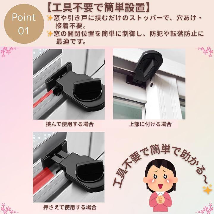 「工具不要で簡単設置」窓や引き戸に挟むだけのストッパーで、穴あけ・接着不要。