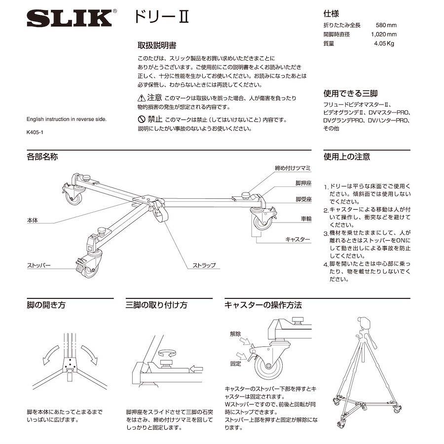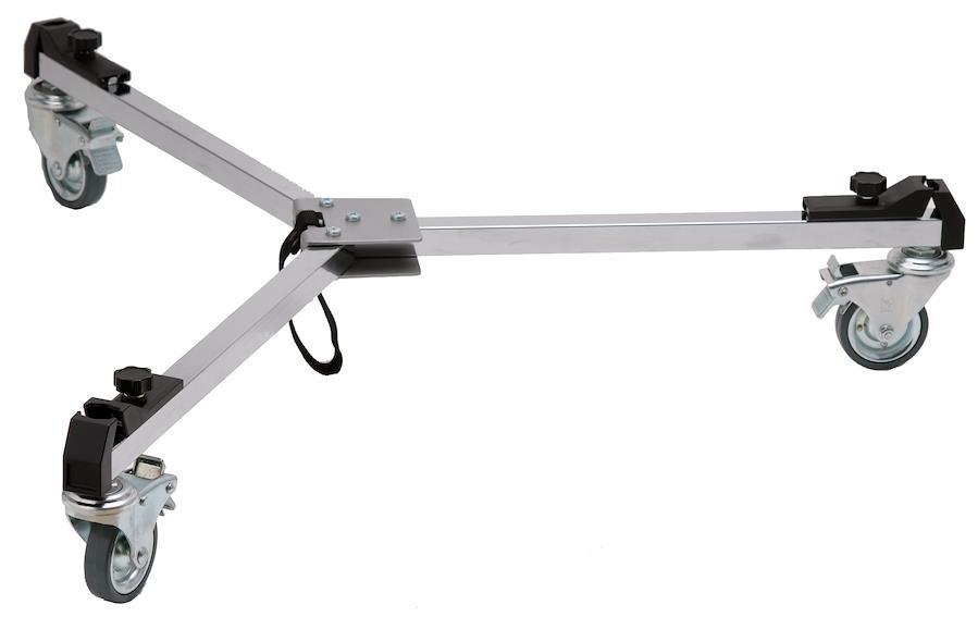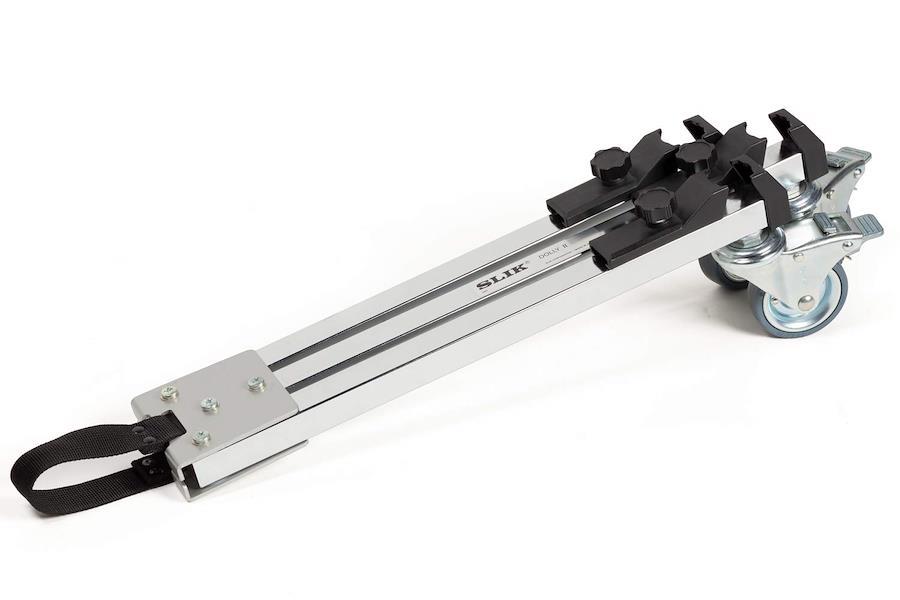 SLIK「ドリーII」は、三脚の石突部分を挟み込み、三脚ごとカメラを移動できます。車輪のストッパーに「ダブルストッパー」を採用。固定時は車輪の回転と向きの両方が一度に固定できます。脚を一方向に畳むことができるので、持ち運びも可能。最大搭載重量が15kgなので、プロ用超大型三脚にも対応。