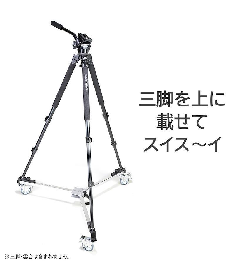 三脚うえに載せ、車輪で水平移動できるようにする三脚アクセサリ対応する機材:三脚開脚時の石突先端部分が直径1,020mm以上に広がる三脚最大搭載重量:15kg / 重量:4,050g取り付け方式:石突ゴムを挟み込むサイズ:縮長:580mm / 最大直径:1,020mm / 高さ:155mm