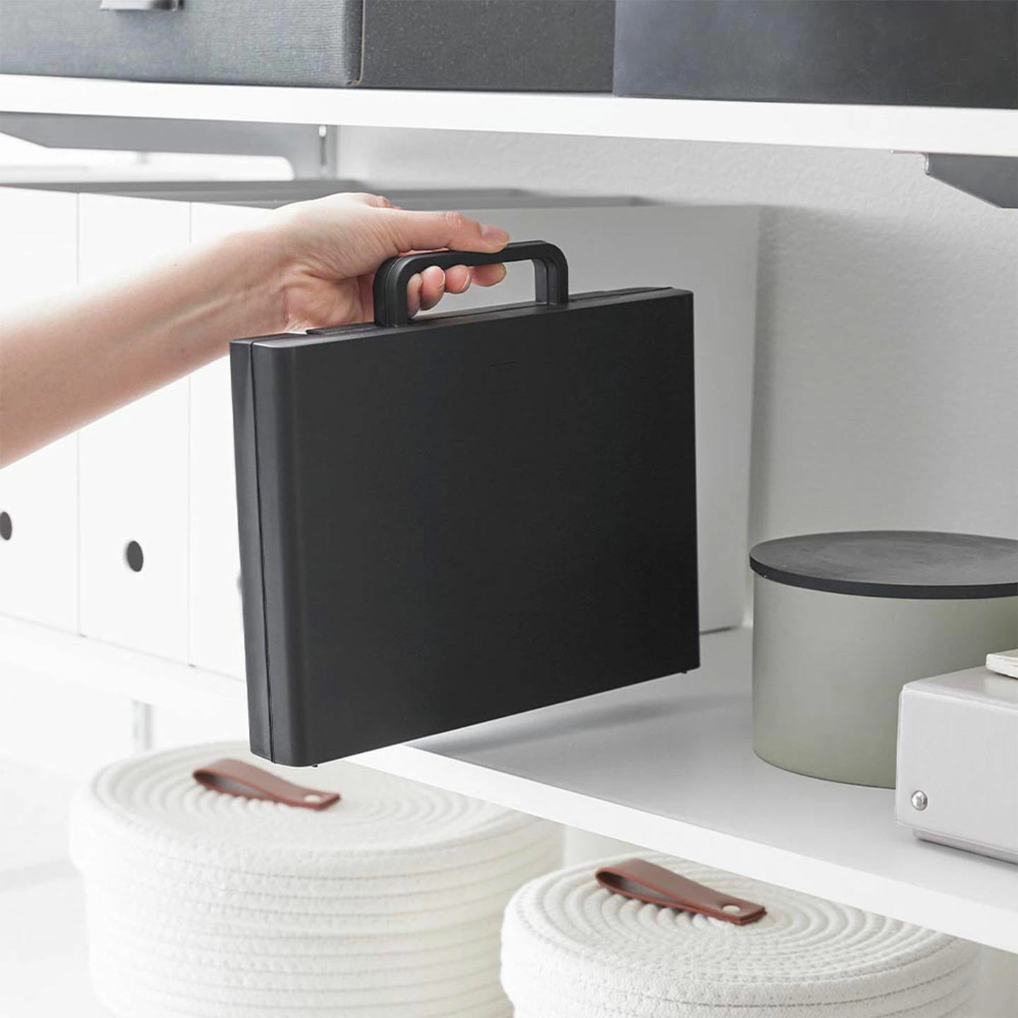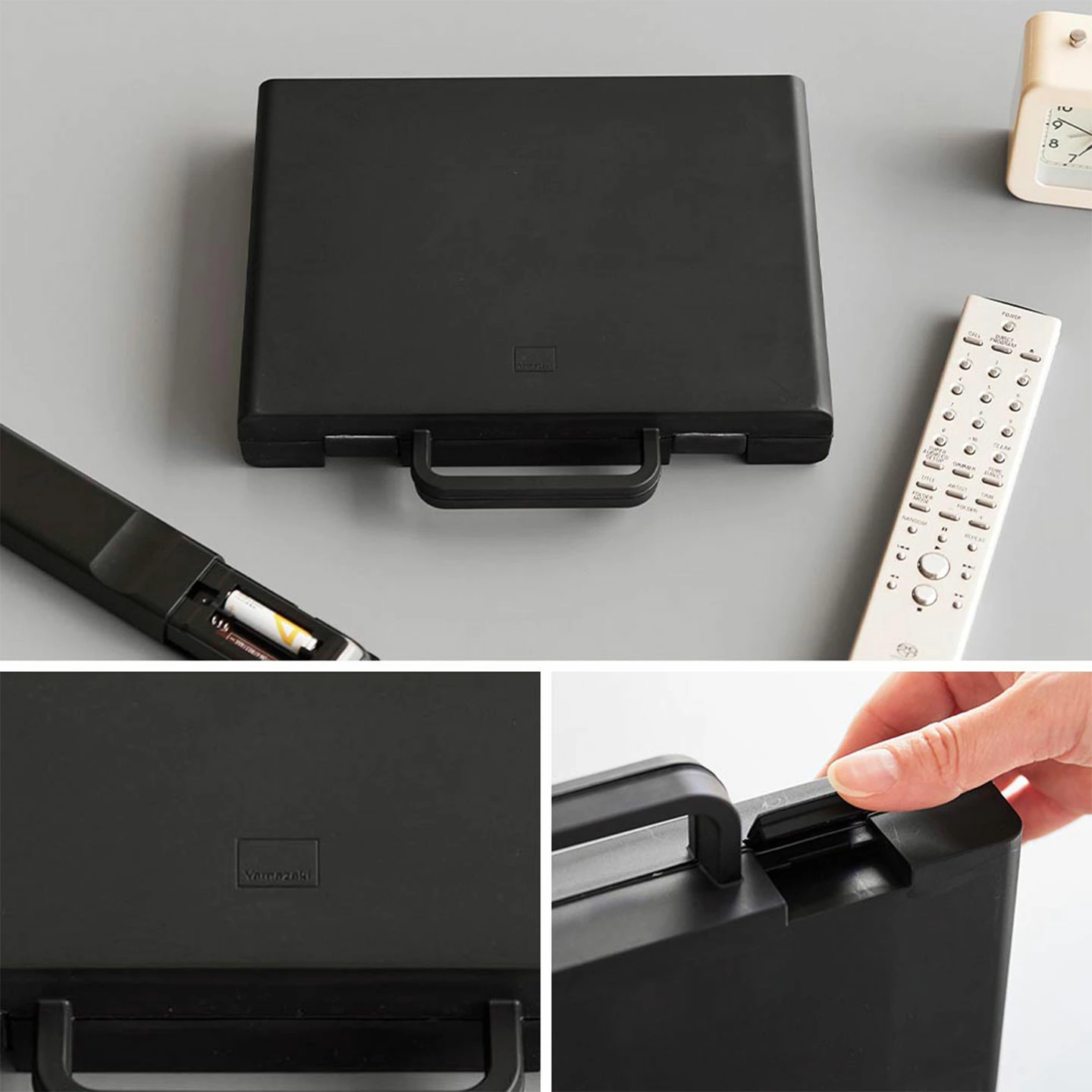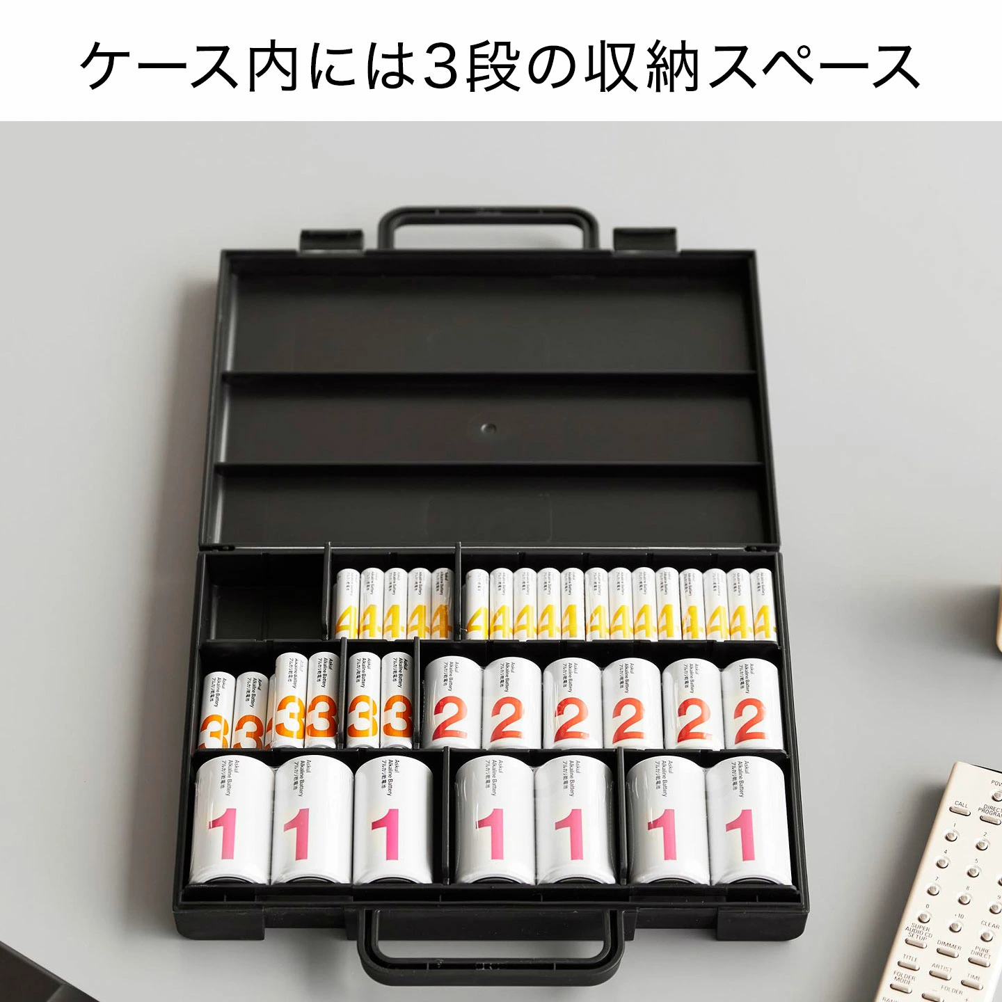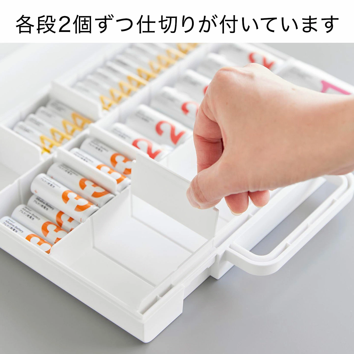 【ハンドル付きスリム分別電池ケース】持ち運びもラクラク、分別して収納できる電池ケースです。電池の種類と数がひと目でわかるので、交換もスムーズ。A4よりコンパクトなスリムサイズで、省スペースにすっきり収納できます。防災用品としても重宝する電池をスマートに保管でき、仕切りの位置を変えれば使用済み電池の管理にも便利です。