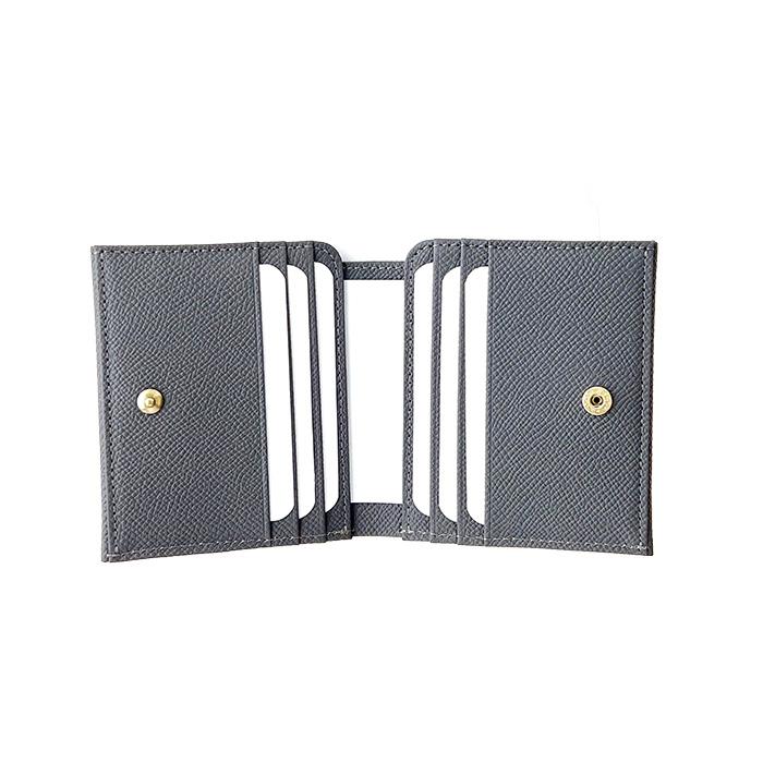 お札入れが2カ所、カード入れ×8枚(カード段6枚+お札仕切り部分に2枚)。外に小銭入れが付いた、お財布としての機能を十分に備えた超薄型タイプです。2つ折りをスナップで止めれるのですっきりしています。オリジナルの国産の牛革を使用。細かい目の型押しをし、エレガントに仕上げました。内装にはスエード調の裏地を使用し、よりエレガントです。スレートグレー、エトープ、ブラックの3色展開