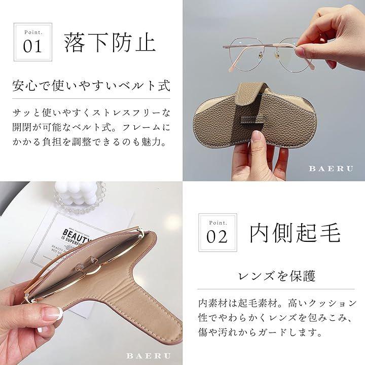 「使い勝手に優れたベルト式」メガネのテンプルをベルトで固定してバッグ等にサッと忍び込ませるだけ。