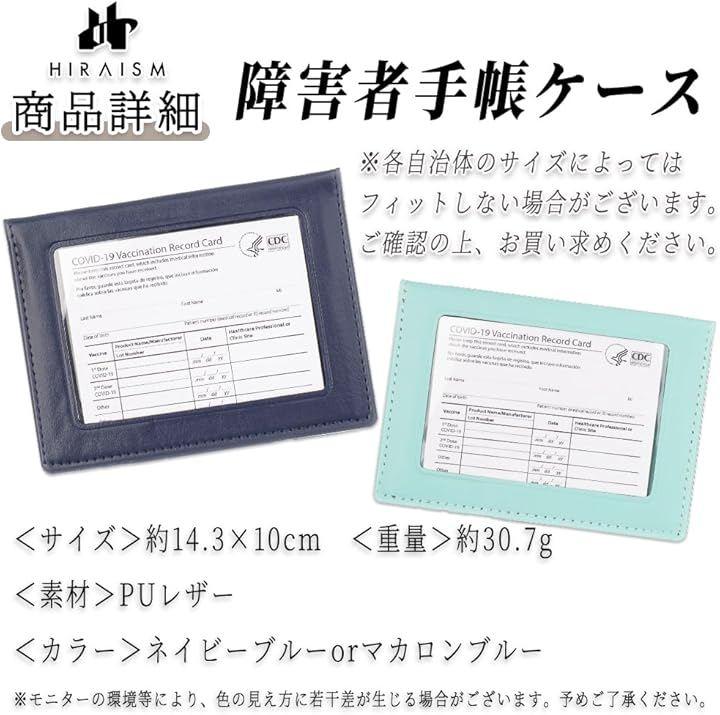 「商品内容」障害者手帳ケース <サイズ>約14.3x10cm <重量>約30.7g <素材>PUレザー <カラー>ネイビーブルーorマカロンブルー *各自治体のサイズによってはフィットしない場合がございます。