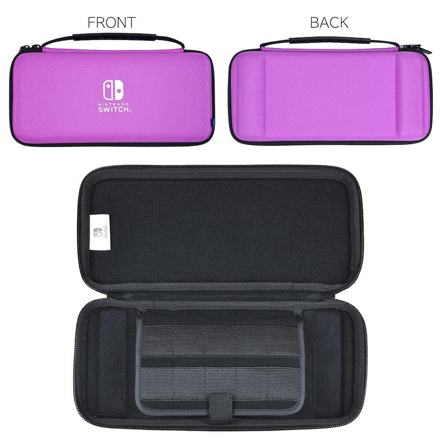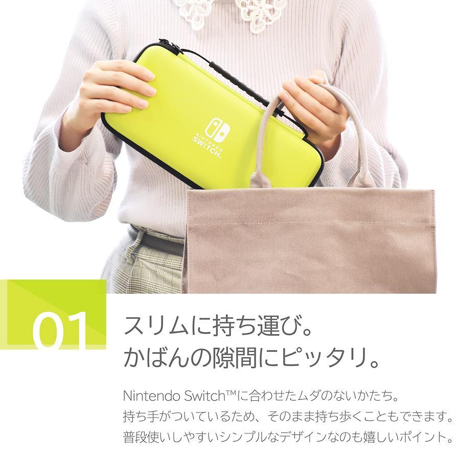 ● 色鮮やかなポップカラーが仲間入り女性やお子様に人気の、あかるい3色が新登場!定番のベーシックカラー「ブラック」「ブルー」「レッド」と合わせて計6色のカラーバリエーションとなったことで、より自分好みの色をお選びいただけるようになりました。● 薄型でコンパクト + 持ち運びに便利な持ち手つきNintendo Switch?に合わせたムダのないかたち。かさばらず省スペースで鞄にしまうことができます。ポーチ自体に持ち手がついているため、鞄にしまわずにそのまま持ち歩いてもOK!普段使いしやすいシンプルなデザインなのも嬉しいポイントです。● 軽くて丈夫なEVA素材で衝撃吸収芯材部分に軽くて丈夫なEVA素材を使用しているため、持ち運ぶ際の衝撃をEVA素材が吸収してくれます。また、Nintendo Switch?に直接触れるポーチ内面は、キズのつきにくい柔らかな起毛素材を使用しているので安心です。● ゲームカード収納ポケット + 画面保護クッションNintendo Switch?本体をとめるセパレーター部分に、Nintendo Switch?専用ゲームカード10枚をしまえる専用ポケットを搭載。また、このセパレーターは厚みのあるクッションになっており、繊細なNintendo Switch?の画面を保護する役割もあります。● 収納できるもの・Nintendo Switch?(有機ELモデル)本体またはNintendo Switch?本体 ×1・Nintendo Switch?専用ゲームカード ×10※ 本品はNintendo Switch? Lite には対応しておりません。※ 使用する際は落下防止のため、必ずセパレーターでNintendo Switch?を固定してください。※ 弊社製カバーとの適合については、弊社ホームページをご確認ください。