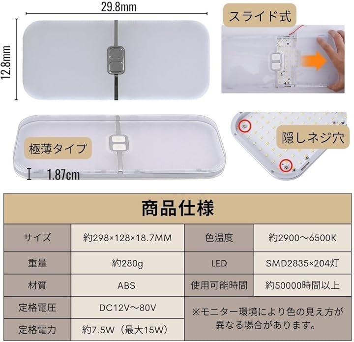 「製品仕様」サイズ:約298x128x18.7mm 重量:約280g ・材質:ABS ・定格電圧:DC12V~80V ・定格電力:約7.5W(最大15W) ・色温度:約2900~6500K ・LED:SMD2835x204灯 使用可能時間:約50000時間以上