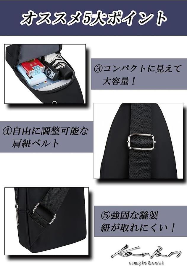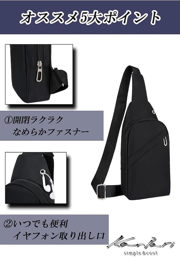 「軽量コンパクトなボディバッグ」Kanpariのボディバッグは、軽量でコンパクトなサイズ感が特徴で、日常の持ち運びに最適です。フロントポケットと背面ポケット、内ポケットが付いており、スマートフォンや財布などの小物を効率的に整理できます。