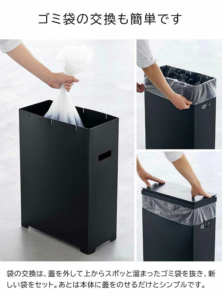 組み立て簡単!45Lゴミ袋がぴったり収まるスリムな横開き蓋付きゴミ箱。蓋が横に開くのでパントリーや食器棚下スペースにも収納可能。複数並べてペットボトル・空き缶・資源ゴミなどの分別におすすめです。蓋付きなので、中身が見えずにおいも防ぐので衛生的。ハンドル穴付きで移動も簡単です。折りたたんで薄く持ち運べるのでアウトドアにもおすすめです。ゴミ袋を掛けて蓋をするだけなのでゴミの取り換え作業が簡単です。