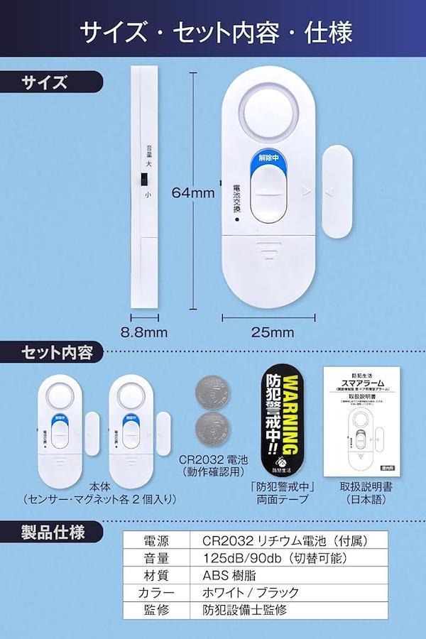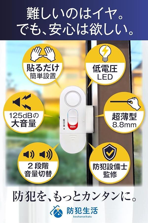 窓やドアが開くと125dBの大音量で警報を鳴らし、侵入を強力に威嚇する防犯グッズです。