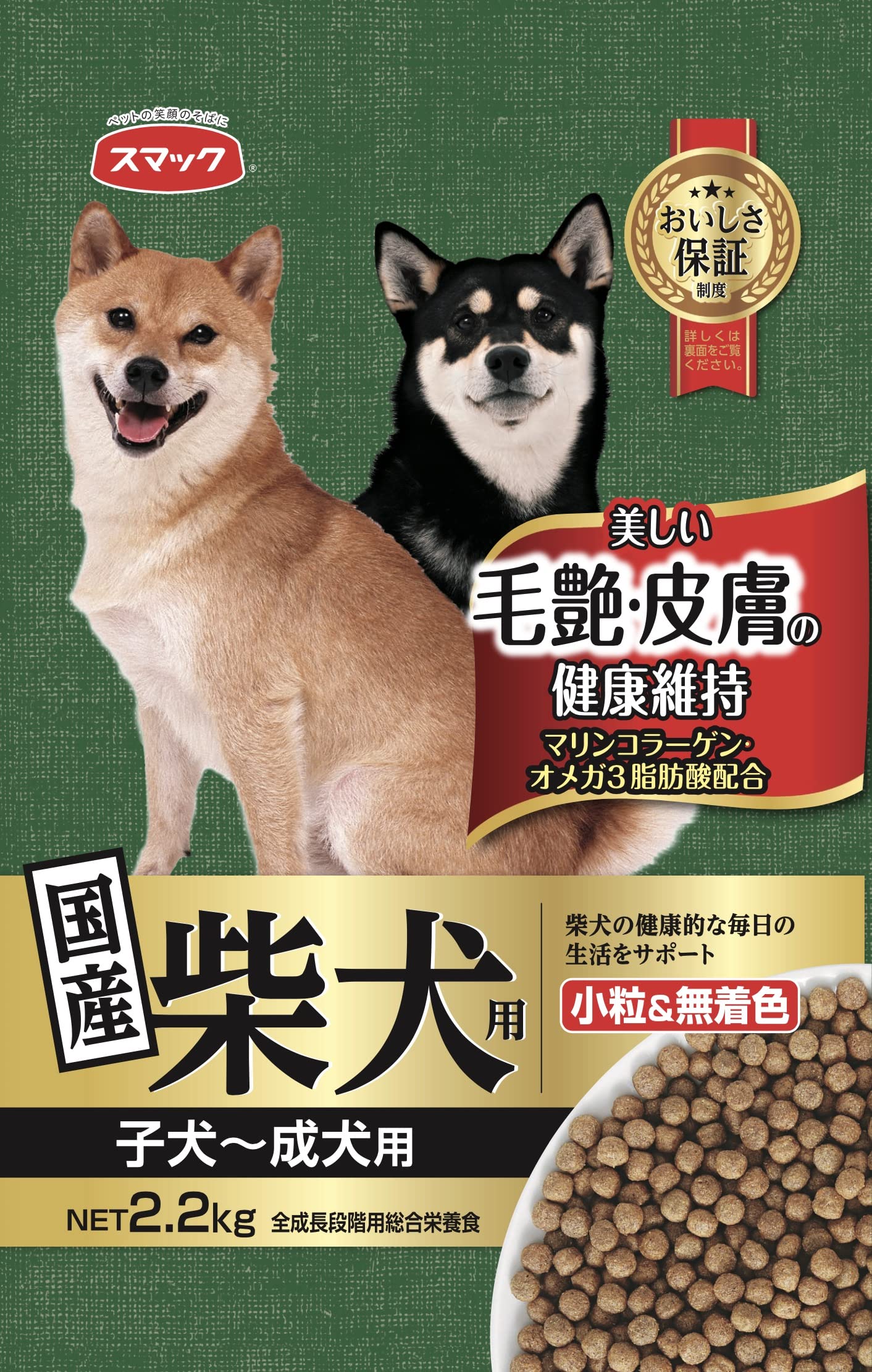 商品紹介 国の天然記念物に指定され、古くから日本人に飼育されてきた柴犬のためのごはんができました。小型犬の柴犬のお口に合わせた小粒タイプです。柴犬の美しい毛艶・皮膚の健康維持のためにマリンコラーゲン、オメガ3脂肪酸(DHA・EPA)を配合しています。また、若くて活発な柴犬のために、良質なたんぱく質を多く含む特別な配合。コロコロな便でトイレの後始末が簡単です。また、植物発酵抽出エキスが腸内の善玉菌を増やし、腸内容物を分解することで便臭を抑えます。 使用上の注意 この商品は犬の栄養バランスを満たしたフードです。犬以外のペットや他の動物には与えないでください。 原材料・成分 穀類(とうもろこし、コーングルテンフィード、パン粉、米糠、小麦粉、コーングルテンミール)、肉類(チキンミール、ポークミール、ミートミール、チキンエキス、チキンレバーパウダー)、油脂類(動物性油脂、フィッシュオイル(オメガ3脂肪酸源として))、豆類(脱脂大豆、乾燥おから等)、魚介類(フィッシュミール、フィッシュパウダー)、EPAパウダー、ビール酵母、マリンコラーゲン、植物発酵抽出エキス、ミネラル類(カルシウム、塩化ナトリウム、亜鉛、鉄、銅、ヨウ素)、ビタミン類(A、D、E、B2、B12、パントテン酸、コリン) 使用方法 本商品と水だけで必要な栄養素をバランス
