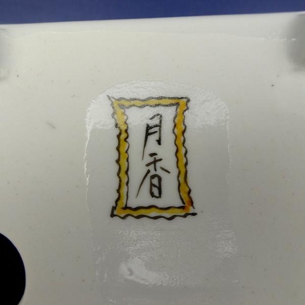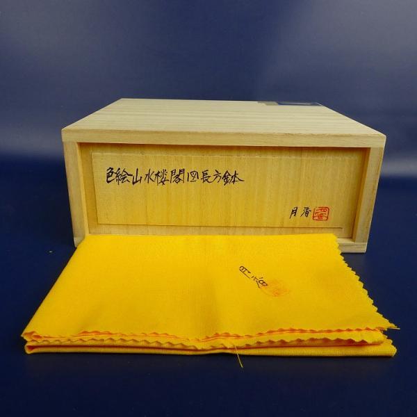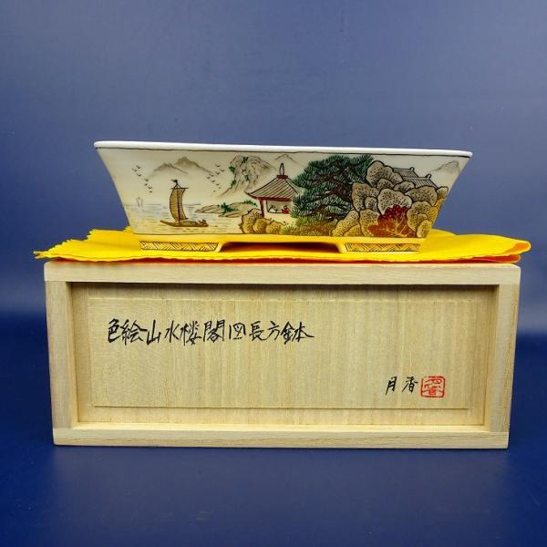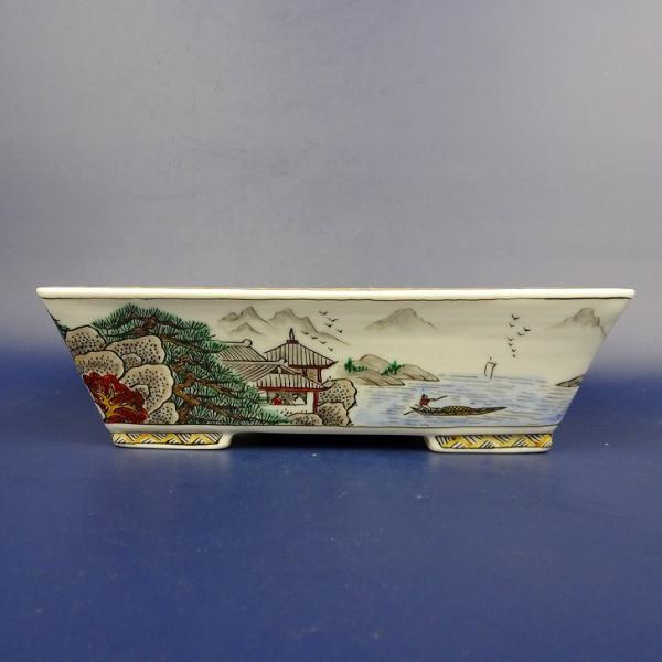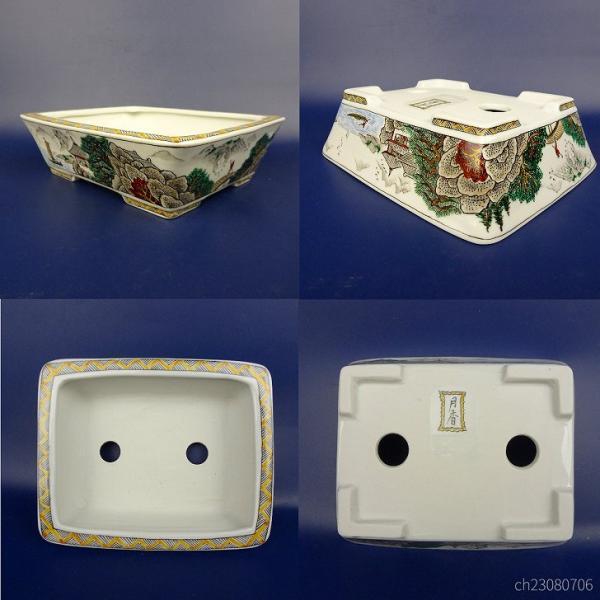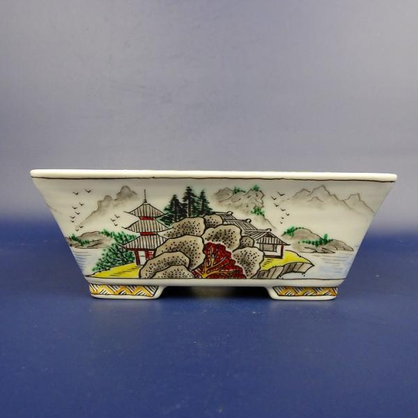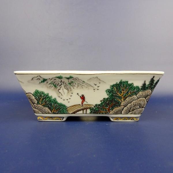 Small bonsai pot, "Gekko" (Moonflower), approximately 15.7cm long, rectangular, painted with a landscape and pavilion design, original fabric and original box, brand new.