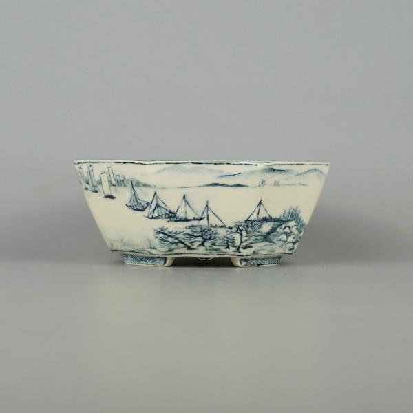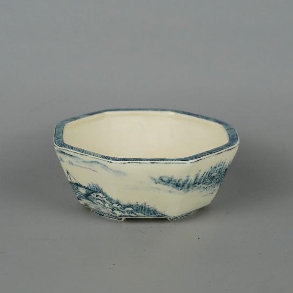 Small bonsai pot, "Shofu" style, approximately 11cm long, octagonal pot, blue and white porcelain with a landscape design featuring a boat. Brand new.