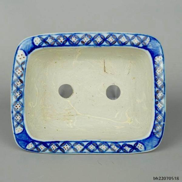 Small bonsai pot, "Tani Arashiyama," approximately 13cm long, rectangular pot, blue and white porcelain with a landscape painting, curved edges, in original condition, used pot